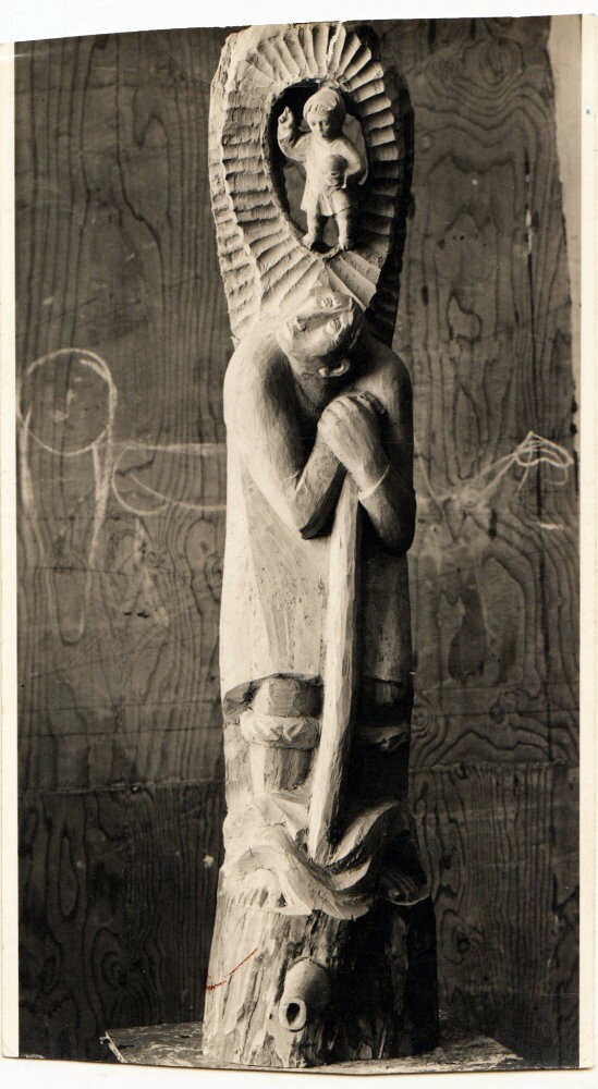 Rückseite des Fotos: „Christopherusbrunnen, 2,80 m aus einem Stamm für Meisterprüfung“ (Bozetto)